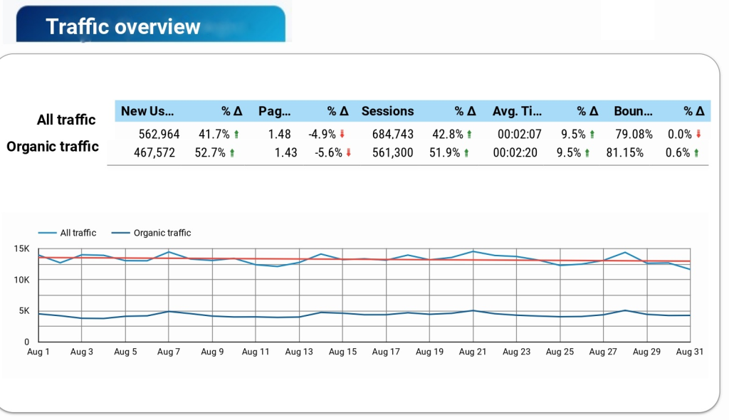 Let’s jump to the dashboard. Section traffic overview is shown how to change the level of traffic during the month and how to change the bulk of organic traffic in this period. As we can see from the board, that traffic has moderately increased and the fluctuation of pages per session is within the normal range.