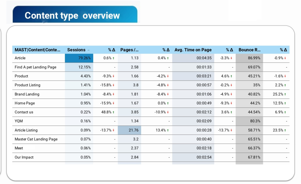 After general research of traffic, let’s dive deeper into how a user interacts with different types of content on the site. The next section shows to us some interesting things like the following: Article Listing – decreasing sessions and session duration on a background of increasing pages per session and BR. What does it mean for us? An article Listing is a list with articles sorted by category and the user on the article listing didn’t spend more time. The user went to Article Listing and after that went to some articles that fit the user’s intent. In this case, the drop on sessions and session duration isn’t so important. The decreasing number of sessions could be caused following reason – users went to the article directly from Google search. To check this hypothesis, the company needs to require additional research of acquiring channels to the article section and more characteristics about the article section. The article section has a large part of traffic, but let’s research it in detail. The user reads articles (session duration nearly 4 minutes), but user’s way is short (nearly 2 pages per session). Why do we have this situation? The answer lay on BR. The company lost their users and high BR (more than 86%) illustrated it. There could be a technical issue (I wrote about it in Page speed report) and user’s intent issue. If the landing page didn’t fit the user, he had gone out from the page (it’s mostly for SEO reasons).