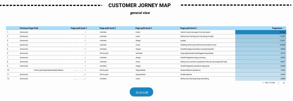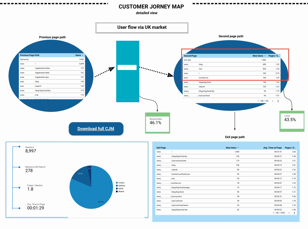 The next section is Customer journey map through the site. Here, I track all user way through the site, first step it’s a table that contained the previous page path. As we can see, most users landed from Google search to the registration section or dog section. After that second user’s step is the way to dog or cat section and Home Page. Here, I highlighted BR and % of exit. Pay attention that these metrics showed different meanings. BR is a metric that described the number of users that immediately exited from the site during first 30 seconds without performing any events. % of exit is a metric that shows how many users exited from a page that was last in the user way. It means that the user went to page read, scroll, etc and after that exit. The exit page table gives us interesting conclusions – the user’s second and first page journeys are just the same as exit pages. It means that users quit from the first page in their journey and proved that the site has a problem with huge BR and all following from this statement problems. The pie chart and indexes near it showed to us channels of user’s engagement and device distribution.