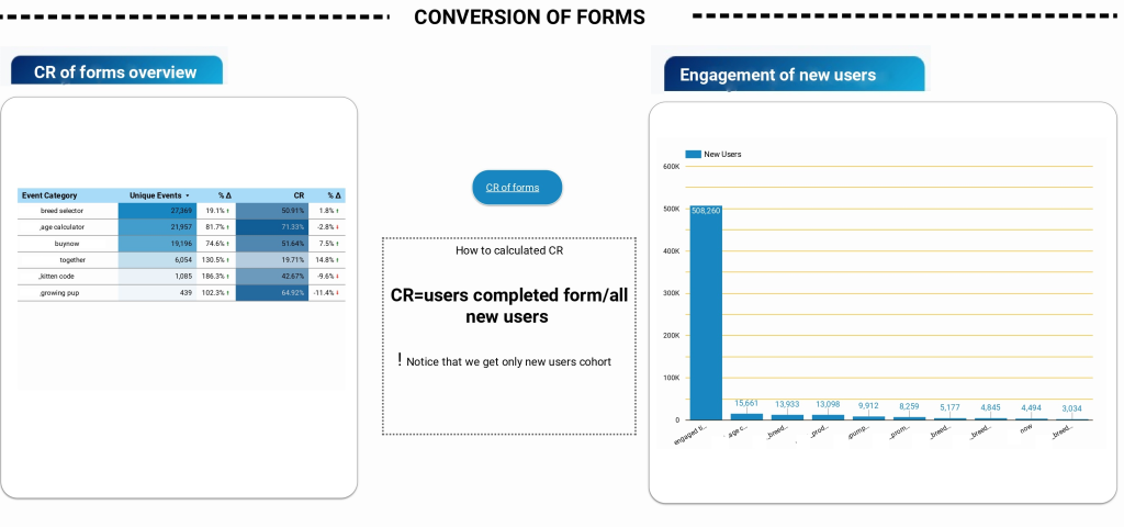 Another interesting part of the report is conversion of the forms. As I mentioned at the top of this article, this site implemented a lot of forms but only two make real conversions. Here, I highlighted the percentage of form conversion and how these events were distributed by user activity. As we can see more popular events are age and breed and more conventional forms are breed selector and age calculator.