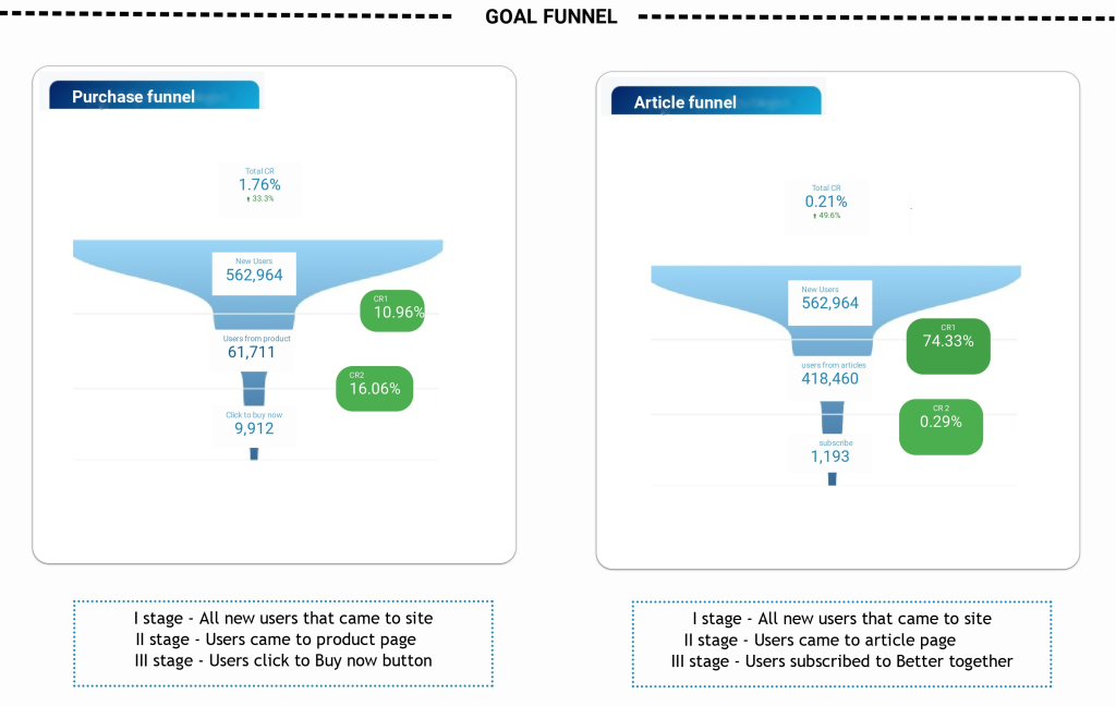 The final section is one of the more “delicious” parts of the report and makes all site’s performance clearer. Here we can see two funnels for the purchaser and reader. As we can see from the product funnel, users from this site prefer more buy than read. Conversion of reader channel is low. It’s alarmed stakeholders and teams that in the article section they need to make some changes and try to make A/B testing.