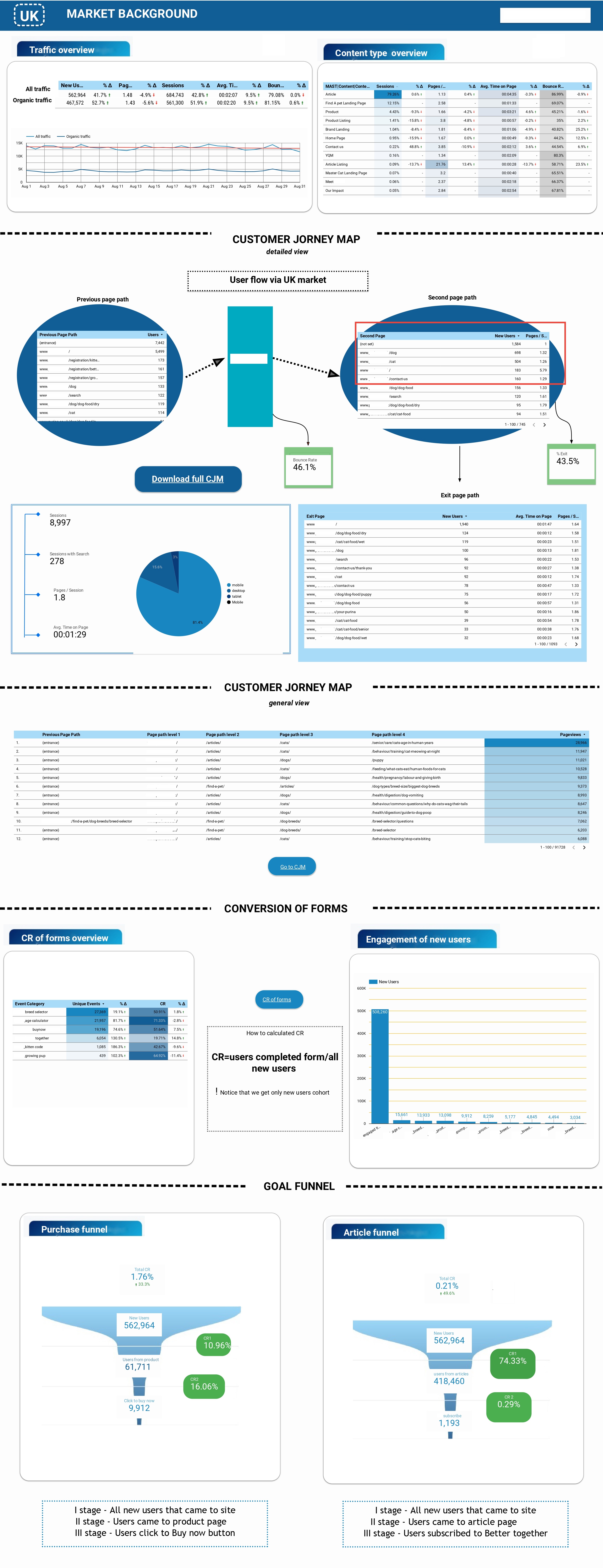 The next section is Customer journey map through the site. Here, I track all user way through the site, first step it’s a table that contained the previous page path. As we can see, most users landed from Google search to the registration section or dog section. After that second user’s step is the way to dog or cat section and Home Page. Here, I highlighted BR and % of exit. Pay attention that these metrics showed different meanings. BR is a metric that described the number of users that immediately exited from the site during first 30 seconds without performing any events. % of exit is a metric that shows how many users exited from a page that was last in the user way. It means that the user went to page read, scroll, etc and after that exit. The exit page table gives us interesting conclusions – the user’s second and first page journeys are just the same as exit pages. It means that users quit from the first page in their journey and proved that the site has a problem with huge BR and all following from this statement problems. The pie chart and indexes near it showed to us channels of user’s engagement and device distribution.